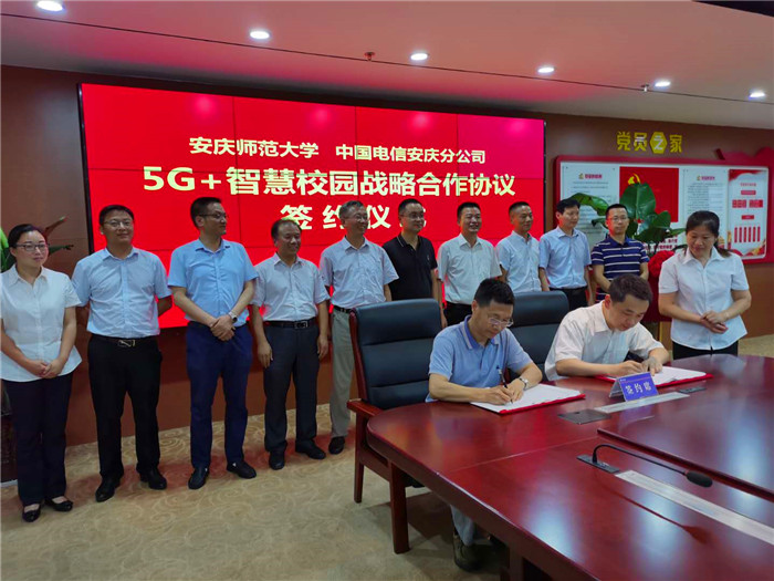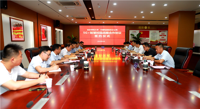 6月18日,9428cn太阳集团与中国电信安庆分公司在筑梦新区会议室举行战略合作签约仪式,副校长汪时珍出席签约仪式并讲话。电信安庆分公司总经理夏小保,9428cn太阳集团科研处、计算机与信息学院、校市合作办等部门负责人参加签约仪式。