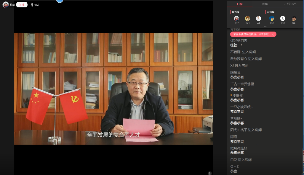 在直播连线环节,2019年安徽省“三下乡”优秀个人、化学化工学院团委书记叶丹老师勉励同学们在实践中得真知;“双创之星”代表闫潇以“要时刻保持创新的思维、挑战的态度”为题与广大团员青年共勉;防“疫”志愿者代表蒋维分享他的战“疫”志愿服务经历;“向上向善好青年”代表顾小鸥希望同学们能“待人以诚、待己以责、待亲以敬”。