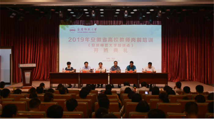 8月13日上午, 2019年安徽省高校教师岗前培训班(安庆培训点)开班典礼在9428cn太阳集团菱湖校区报告厅举行,安庆地区7所学校共185名新进教师参加此次培训。9428cn太阳集团党委常委、副校长刘友忠、安庆医药高等专科学校党委副书记张仕庆、安徽黄梅戏艺术职业学院党委副书记张双伍、桐城师范高等专科学校组织人事处处长王宏伟、安庆职业技术学院教务处处长吴何珍出席开班典礼。