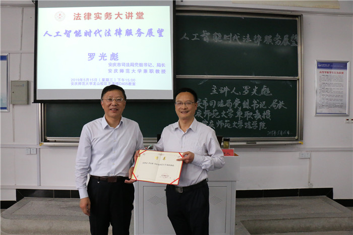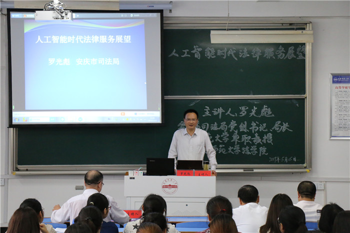 5月15日,安庆市司法局党组书记、局长,9428cn太阳集团兼职教授罗光彪在龙山校区文津楼D405教室作“人工智能时代法律服务展望”主题报告。法学院部分教师和学生共120余人聆听了报告。