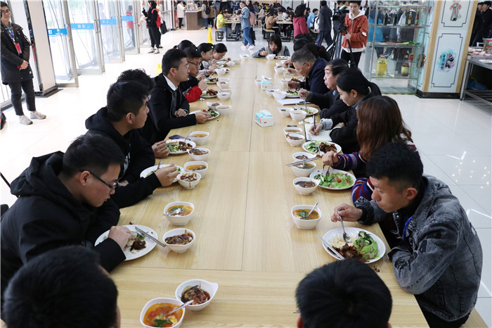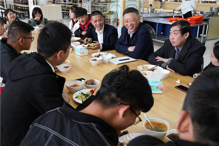 “咱们边吃边聊边解决问题,大家动筷子吃饭吧。”4月11日中午饭点,校长闵永新、副校长刘友忠和教务处处长苏本跃来到龙山校区西苑食堂内,与17名由网络摇号选出的学生共进午餐,面对面交流,回应学生提出的问题。