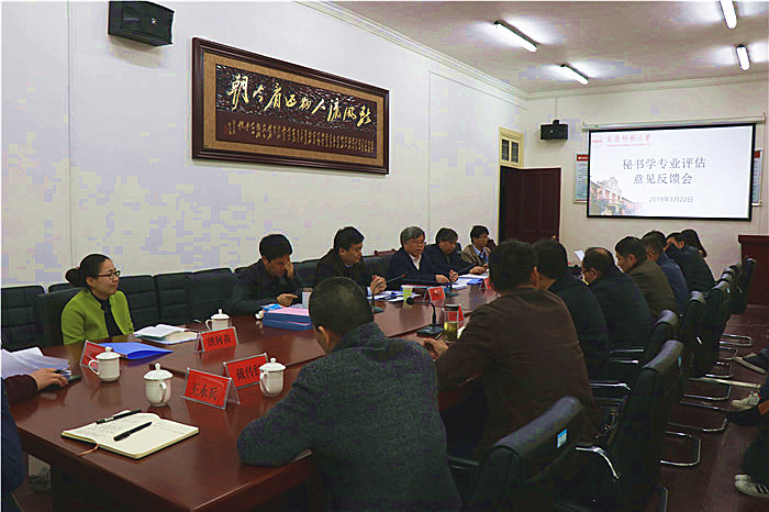 3月22日,由陕西师范大学文学院院长、国务院学科评议组成员张新科教授、南京师范大学文学院院长高峰教授、河南师范大学文学院院长李永贤教授、安徽大学文学院院长吴怀东教授、淮北师范大学文学院院长周有斌教授等组成的安徽省普通本科秘书学专业评估专家组一行6人莅临9428cn太阳集团,开展秘书学专业评估工作。校党委常委、副校长张群教授,文学院领导班子,教务处、人事处、科研处、学生处等职能部门主要负责人参加了秘书学专业评估意见反馈会。