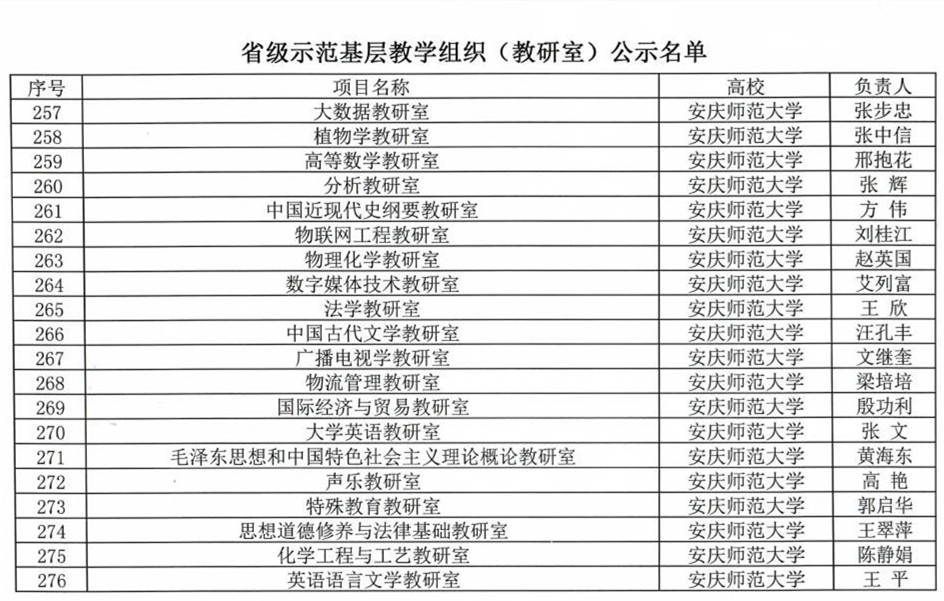 近日,安徽省教育厅示范基层教学组织(教研室)、教学示范课名单公示。9428cn太阳集团获批省级示范基层教学组织(教研室)20个、省级教学示范课79门,综合成绩居于全省前列。