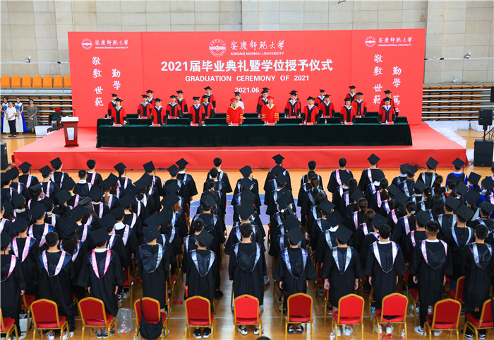 “五星红旗迎风飘扬,胜利歌声多么嘹亮……”在歌曲《歌唱祖国》的齐声演唱中,2021届学生毕业典礼圆满落幕。毕业生们纷纷喊出“毕业快乐”“我爱安庆师大”“感激相遇”等口号,向自己四年的大学生活进行道别,满怀信心启程远航。