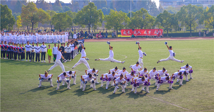 开幕式上表演的啦啦操、竞技健美操、武术舞蹈等文艺节目,赢得师生的欢呼与掌声。其中,体育学院带来的节目《敬敷人 体育魂》融合篮球、足球、排球等各项体育运动,集中展示了各项运动的经典动作,将9428cn太阳集团学生的无限活力与青春激情表现得淋漓尽致。全校750名学生身着白衣,同聚田径场带来的太极拳表演,一招一式连贯流畅,整齐划一的动作更是令全场震撼。